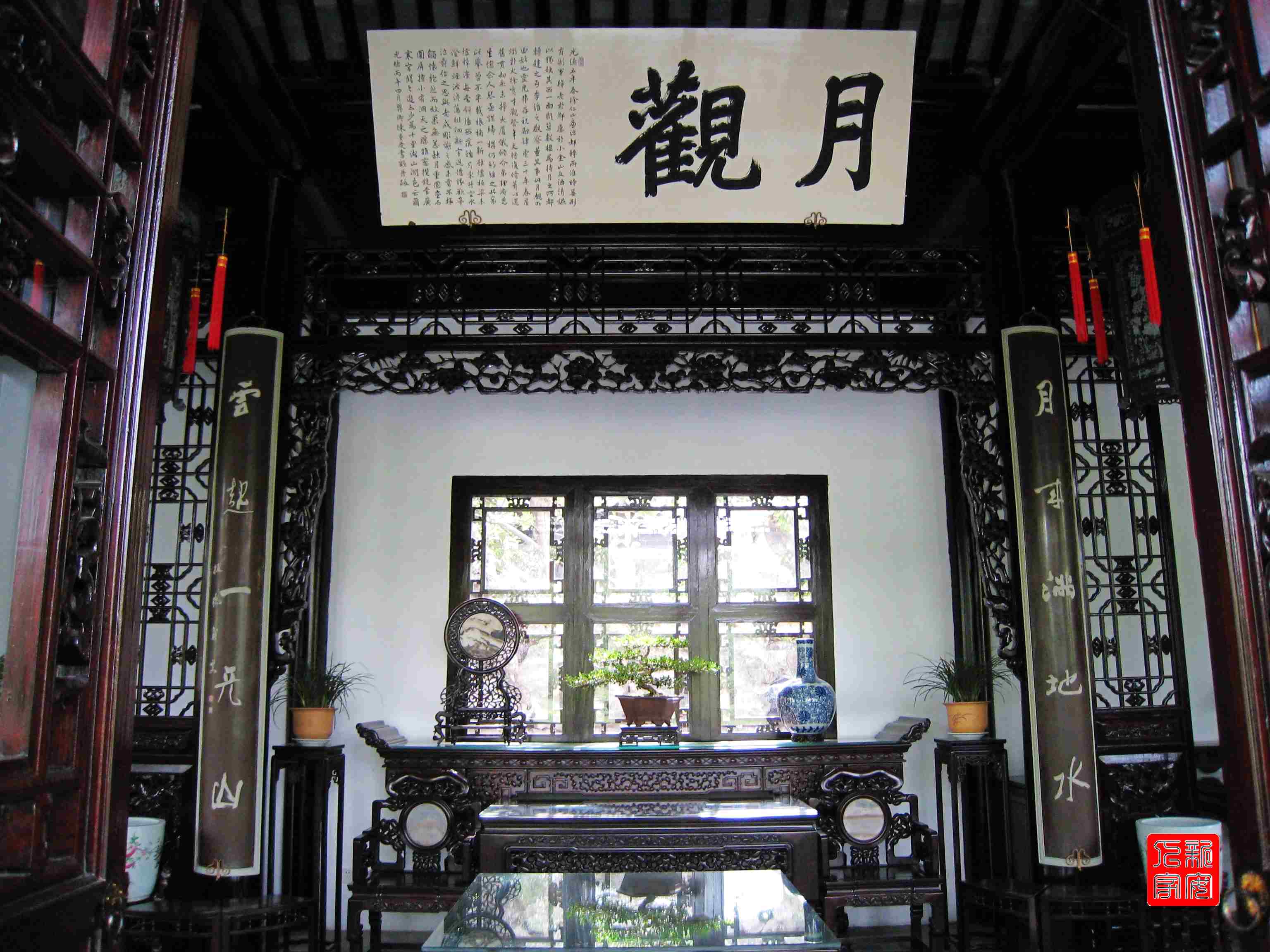月觀中的海梅家具也很有特點(diǎn),雕刻的內(nèi)容都和賞月有關(guān)。那些蓮花、鴛鴦、荷葉,藕節(jié),無不自然生動(dòng),是揚(yáng)州木雕工藝的代表作品。