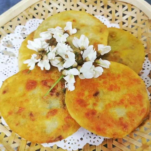 昨天 恰巧看到有人拿竹竿打下了好多槐花,我統(tǒng)統(tǒng)買了回來(lái),足有8斤多!回來(lái)后請(qǐng)廚師用清水洗凈,用鹽水浸泡,揉面焯水,裹調(diào)拍打成形,兩面煎烤,一塊塊槐花餅受熱膨脹,香氣四溢!不由得垂涎滴襟腸肚慌,眾人爭(zhēng)相把餅嘗。咬一口松軟彈牙,嚼著嚼著清香可口,唇齒間留住了春天的味道,妙不可言!淡淡的槐花和雞蛋的香味,讓你的味蕾綻放開來(lái),那種焦、香、酥、脆的感覺(jué)會(huì)讓你久久不能忘懷!嚼著嚼著,眼前浮現(xiàn)童年時(shí)的光景,小河脈脈,蛙聲四起。也許這種悠長(zhǎng)的懷念,就是鄉(xiāng)愁!