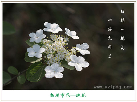 瓊花為揚(yáng)州市花,自古以來(lái)有“維揚(yáng)一株花,四海無(wú)同類”的美譽(yù)。瓊花是我國(guó)特有的名花,文獻(xiàn)記載唐朝就有栽培,瓊花的壽命較長(zhǎng),揚(yáng)州大明寺內(nèi)一株清朝康熙年間種植的瓊花,已有300多年的歷史,如今依然繁茂,風(fēng)姿如故,風(fēng)韻仍不減當(dāng)年。它以淡雅的風(fēng)姿和獨(dú)特的風(fēng)韻,以及種種富有傳奇浪漫色彩的傳說(shuō)和逸聞逸事,博得了世人的厚愛(ài)和文人墨客的不絕贊賞,被稱為“稀世的奇花異卉”和“中國(guó)獨(dú)特的仙花”。